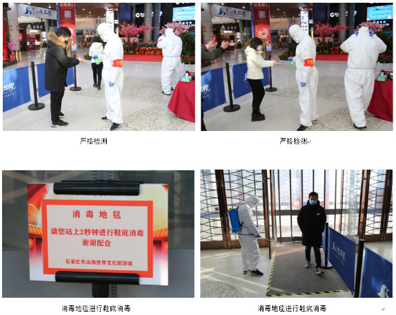 在天山海世界,不仅进行严格检测,还专门设置了消毒地毯,只要站在上边短短两秒钟就能实现对鞋底的消毒。