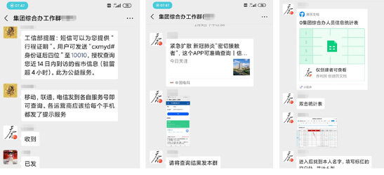 随后又在全集团推行专业APP排查新冠肺炎密切接触者查询和三大运营商提供的个人行动轨迹查询,要求每一名员工认真填写并将结果进行反馈,不瞒报,不漏报,不虚报,确保万无一失。